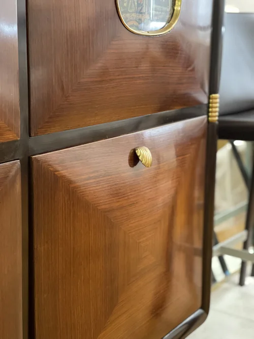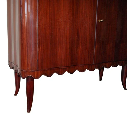Italian Bar Cabinet, design Paolo Buffa, circa 1940s made of walnut with scalloped bottom and horn legs. Multiple insider refinements and details such as mirror interiors, interior drawers and metal glass. Dimensions: Width 43.3" - depth 18" - height 49". Made in Italy.