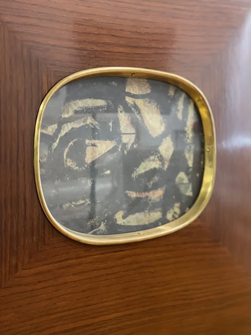 Important Osvaldo Borsani attributed Italian Bar Cabinet with exquisite details, circa 1950s. Large size with 6 raised doors and four tapered round legs with brass details. Sourced in Italy. The three top doors feature inset medallions with an abstract design attributed to Fornasetti. The inside compartment feature a shelf each at the sides and a central compartment with mirrored sides a glass shelf and lacquered red glass bottom. A light can be eventually installed wire is present at the back. The bottom compartments feature shelves and drawers. Plenty of storage space.