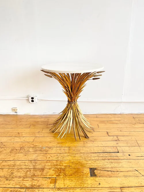Wheat Sheaf Cocktail Table made of a gilt metal base and a white marble round top. The table top is not affixed to the base and can be easily changed to a glass top or any other top of your choice. This table is authentic from the 1950 and carries original Salvadori tag and made in Italy imprint on metal. Due to it’s age the item presents singes of use and wear. Table top presents few faint scratches and some nicks on the edges please refer to pictures.